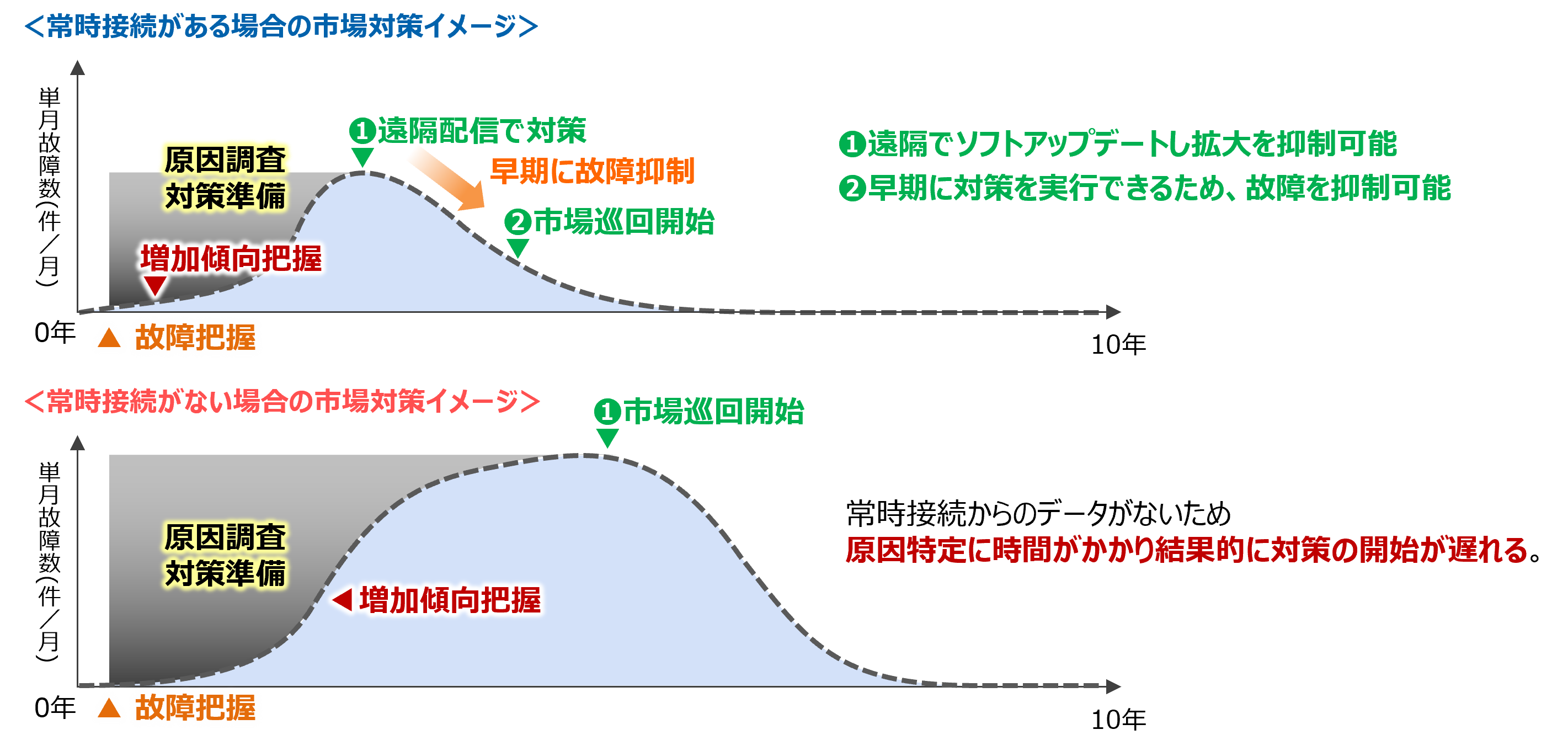 In contrast, without always-on connection, even if the initial failure recognition and investigation start at the same time, it takes considerably longer to grasp overall failure trends across the market. As a result, countermeasure preparation is delayed, and onsite investigations begin only after failures have already become widespread.