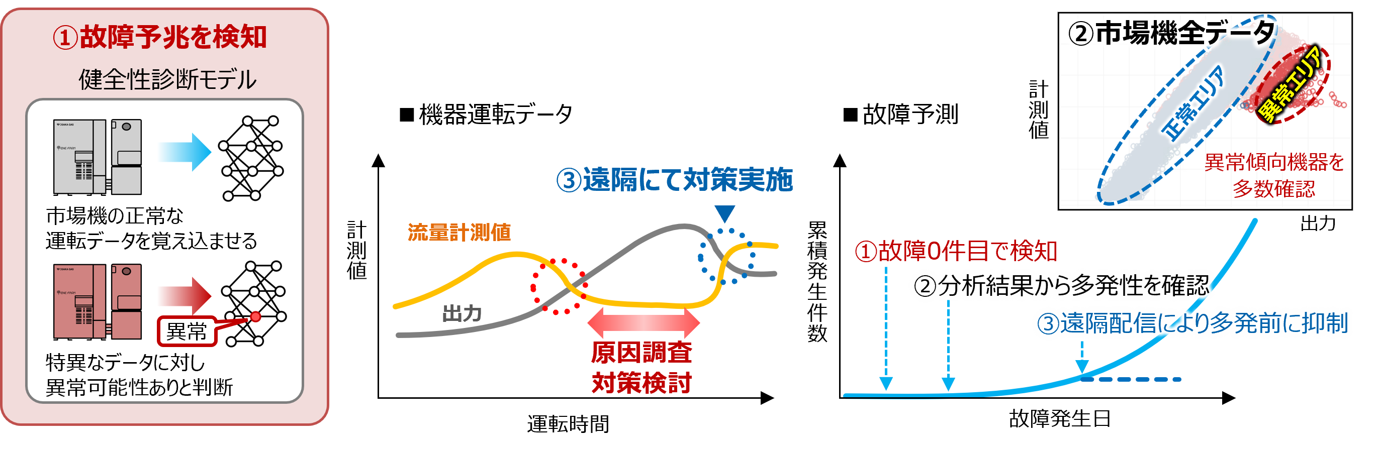 By leveraging big data obtained through continual connectivity and applying AI technologies, we have developed predictive failure logic capable of detecting subtle deviations from normal operating conditions—patterns that are difficult to identify through human observation alone. This enables early initiation of root cause analysis and assessment of potential widespread failure risks before issues become apparent in the field.