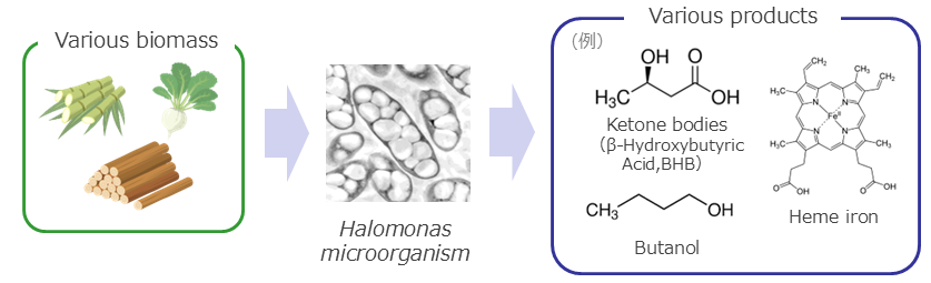 Osaka Gas has successfully developed a technology to mass-produce ketone bodies (β-Hydroxybutyric Acid, BHB) through fermentation using a microorganism called Halomonas (*1). Our proprietary Halomonas possess characteristics suitable for biomanufacturing, and we are utilizing this microorganism to create fermentation processes for producing various substances.