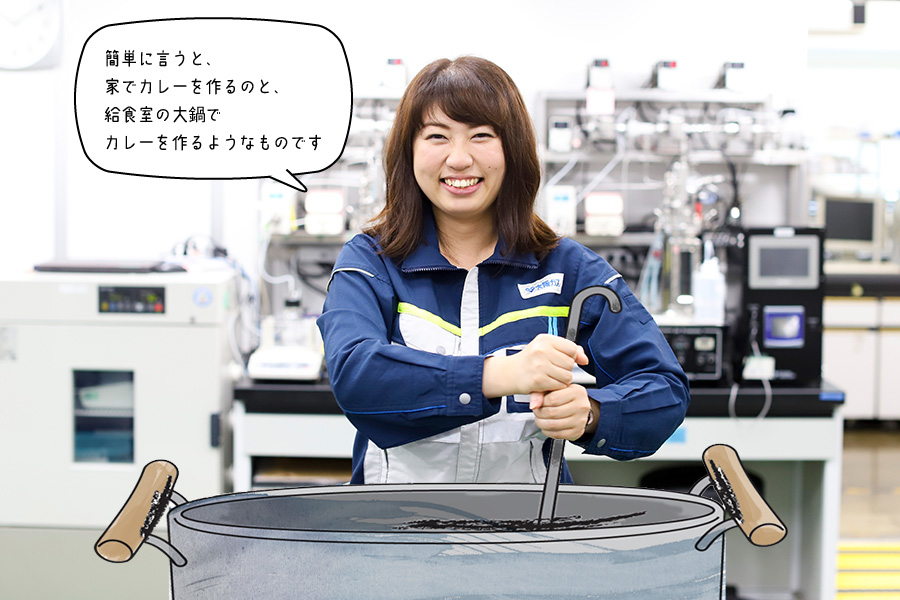 イメージしてもらえましたか! そうやって大量生産する時の「容器の大きさ」「温度」「かくはんする速度と回数」「酸素の濃度」などの条件を実験室で何度も試行錯誤しながら再現し最適なものを探し出しました。今、使用している発酵タンクは縦長なので、上部と下部では発酵液の条件が均一になりにくいんです。例えば上部は酸素濃度が低め、下部は上部の水圧を受けるので酸素濃度も高め。菌の気持ちを理解して、しっかり働いてくれる条件を整えるのはけっこう大変なんです。