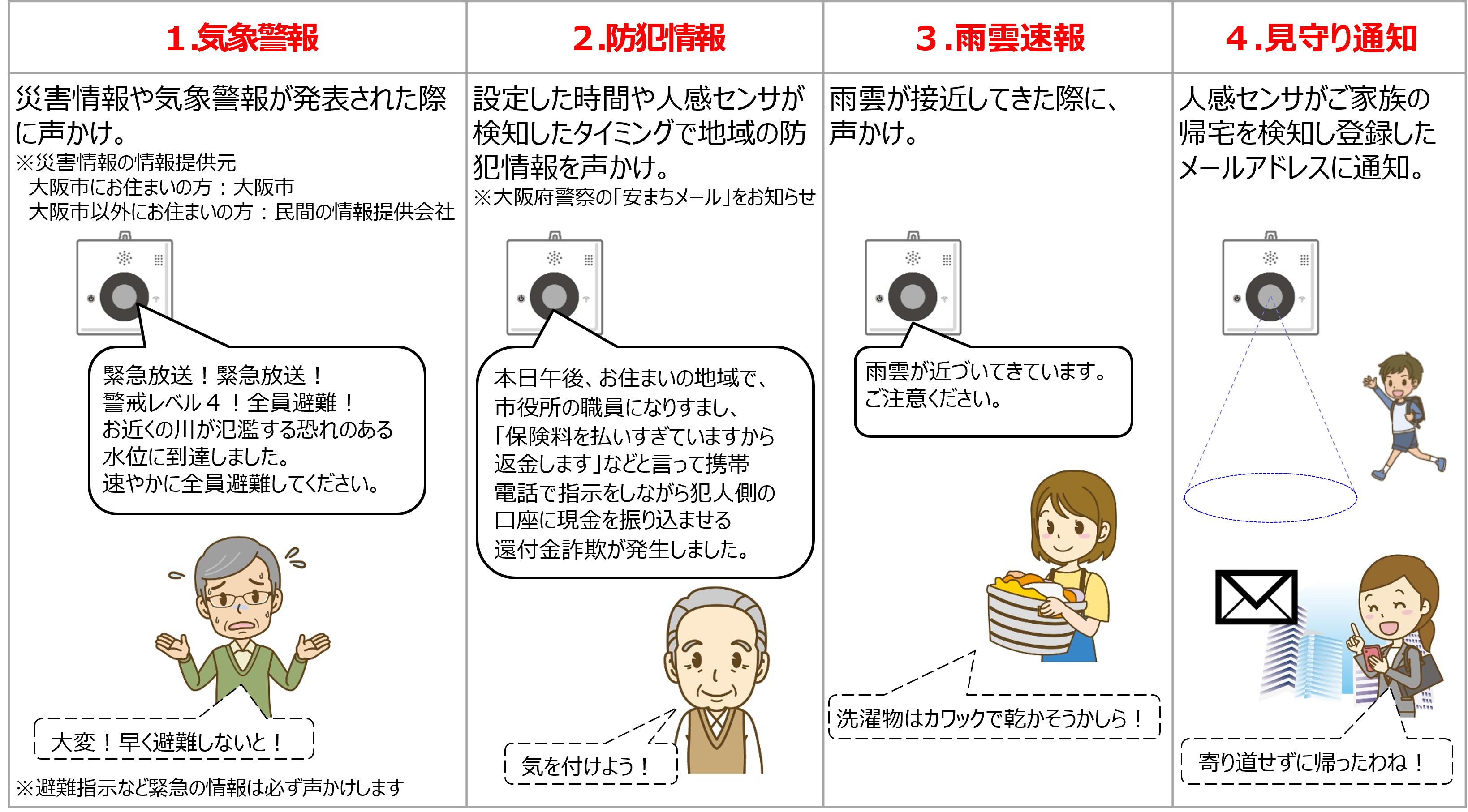 防災情報や防犯情報をタイムリーにスマぴこからお知らせすることで、安心安全な暮らしをご提供します。また生活に関連する情報など様々な情報を発話させることで便利で快適な暮らしもご提供します。